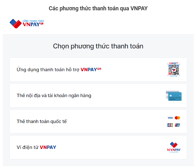 Cổng thanh toán VNPAY là giải pháp thanh toán do Công ty Cổ phần Giải pháp Thanh toán Việt Nam (VNPAY) phát triển. Khách hàng sử dụng thẻ/tài khoản ngân hàng, tính năng QR Pay/VNPAY-QR được tích hợp sẵn trên ứng dụng Mobile Banking của các ngân hàng hoặc Ví điện tử liên kết để thanh toán các giao dịch và nhập mã giảm giá (nếu có)