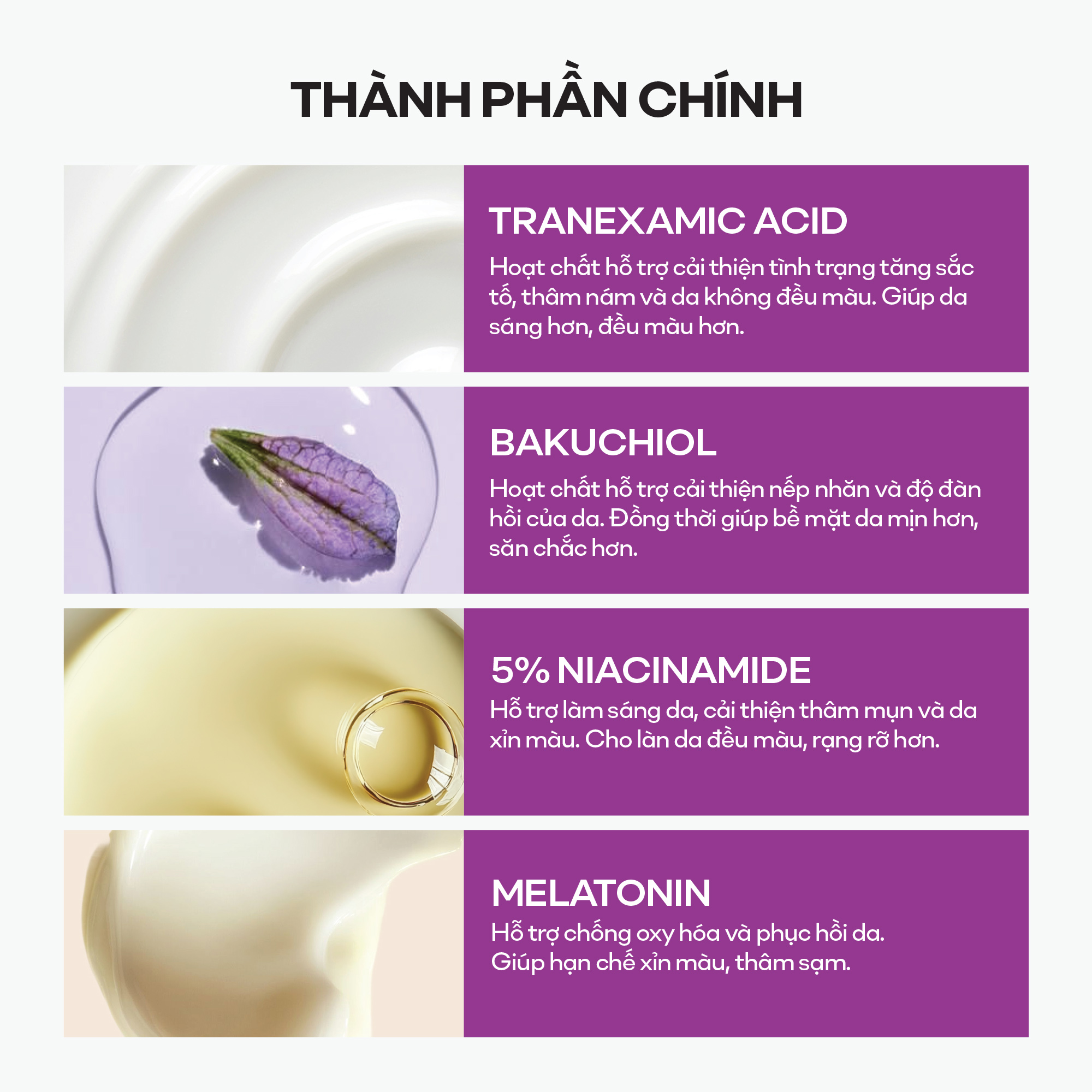 Aqua, 5% Niacinamide, Caprylic/Capric Triglyceride, Ethylhexyl Palmitate, Glycerin, Butylene Glycol, Arisaema Amurense Extract, Cetearyl Alcohol, Dimethicone, Glyceryl Stearate, Hexylresorcinol, Peg-100 Stearate, 0.5% Melatonin, 0.5% Tranexamic Acid, 0.5% Allantoin, 0.5% Bakuchiol, Arginine, Camellia Japonica Seed Oil, Hydroxyethyl Acrylate/Sodium Acryloyldimethyl Taurate Copolymer, Decyl Glucoside, Hydrogenated Polydecene, Carbomer, Polysorbate 80, Disodium Edta, Ethylhexylglycerin, Phenoxyethanol, Parfum, 1,2-Hexanediol.