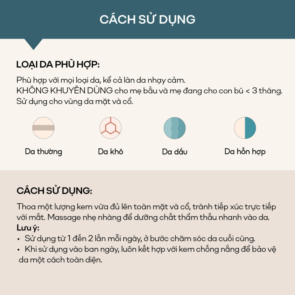 Thoa một lượng kem vừa đủ lên toàn mặt và cổ, tránh tiếp xúc trực tiếp với mắt. Massage nhẹ nhàng để dưỡng chất thẩm thấu nhanh vào da. Sử dụng từ 1 đến 2 lần mỗi ngày, ở bước chăm sóc da cuối cùng. Khi sử dụng vào ban ngày, luôn kết hợp với kem chống nắng để bảo vệ da một cách toàn diện.