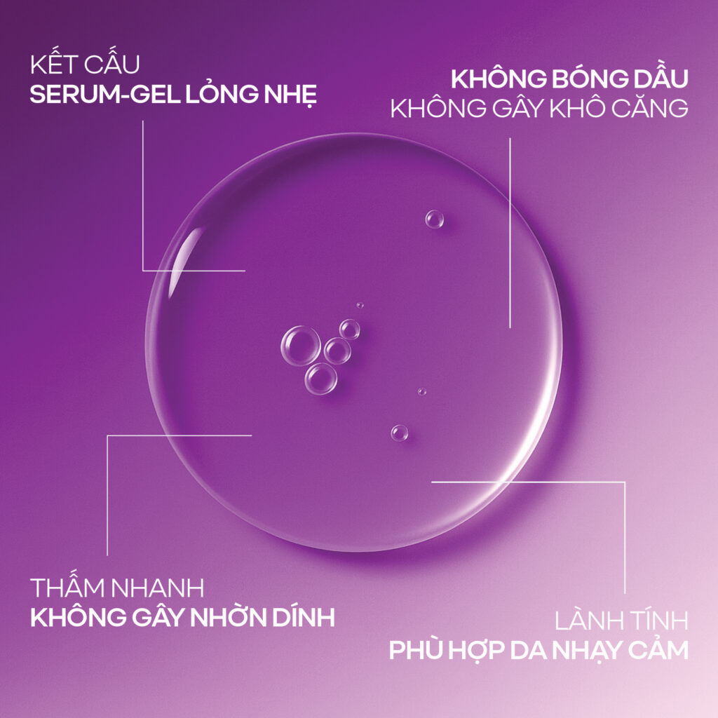Kết cấu serum-gel lỏng nhẹ, thấm nhanh, không gây nhờn rít, không gây khô căng, phù hợp cho cả làn nhạy cảm.